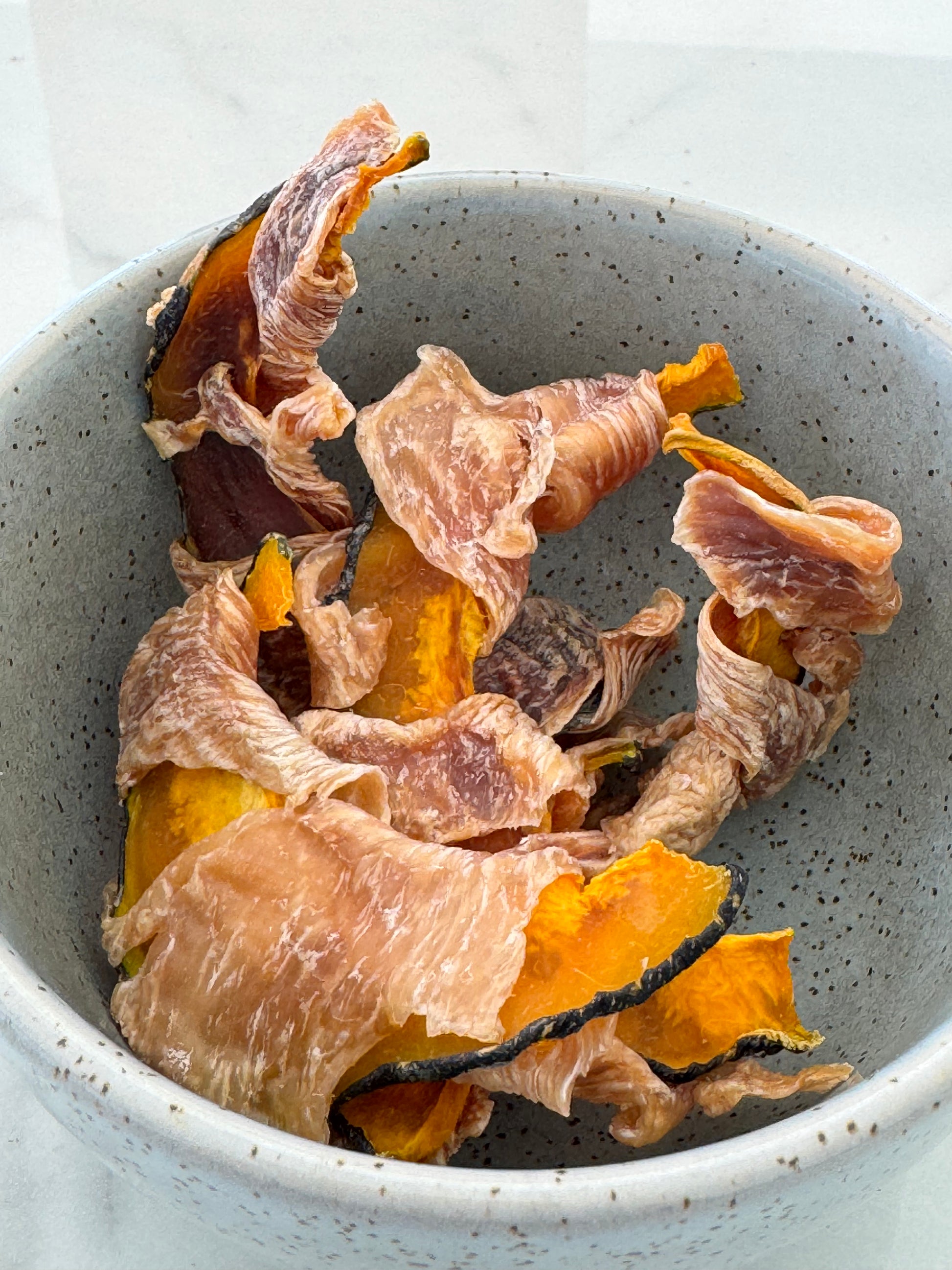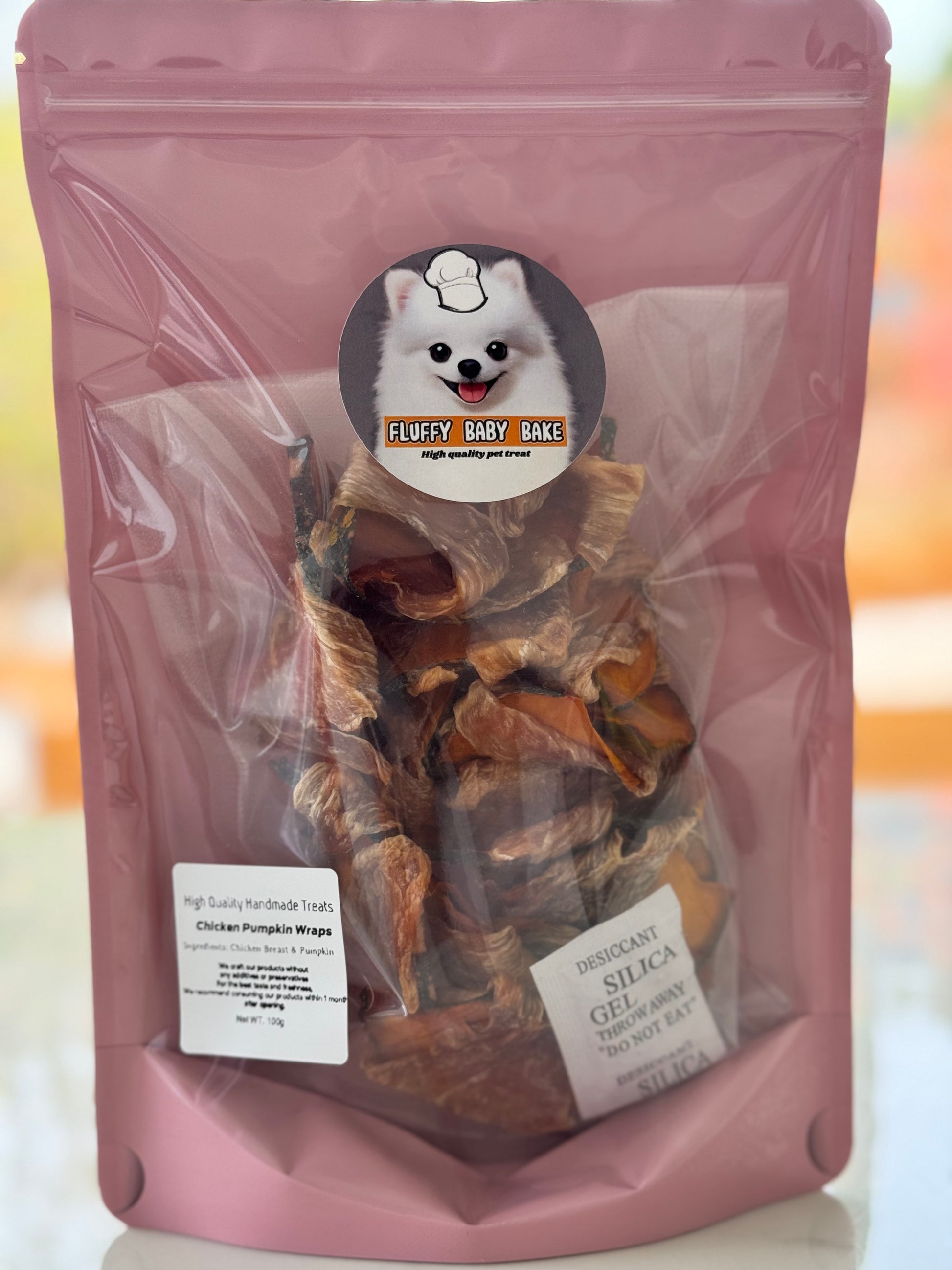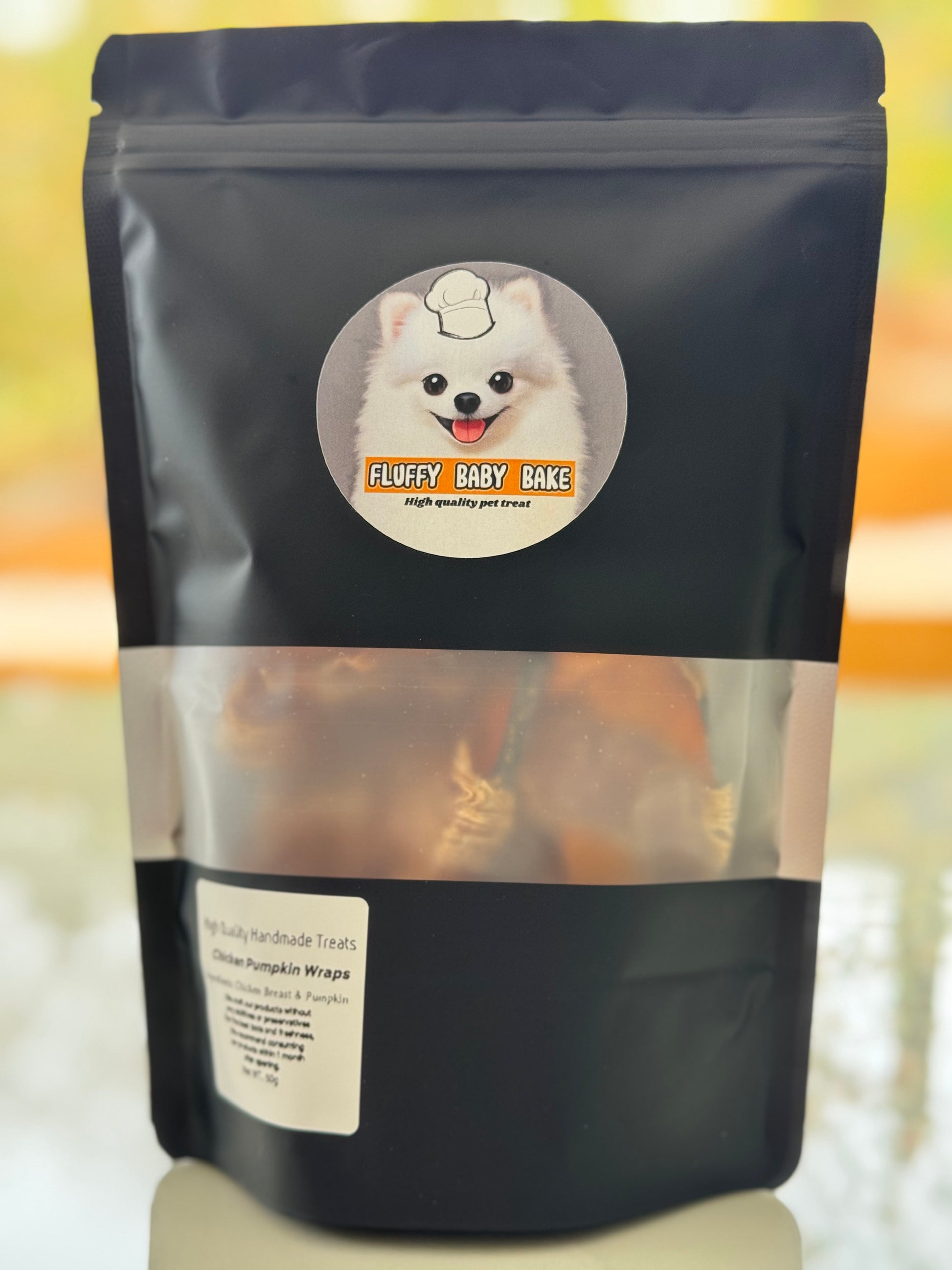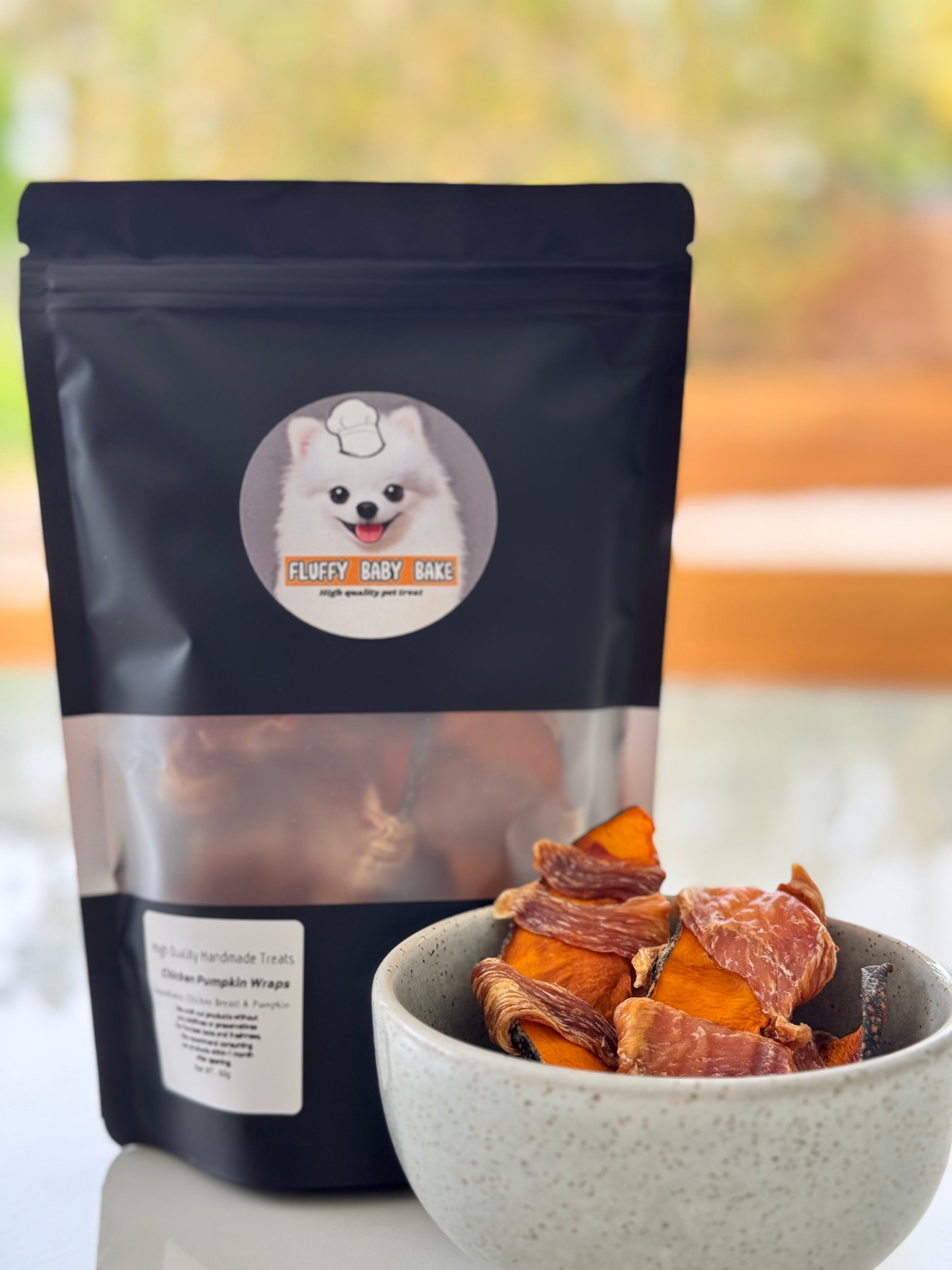 At Fluffy Baby Bake, we hand-wrap each treat in small batches, using ethically sourced chicken and locally grown pumpkin (no seeds or rind!). Slowly dehydrated to lock in nutrients and flavour, these wraps are made in a facility dedicated to purity and quality.