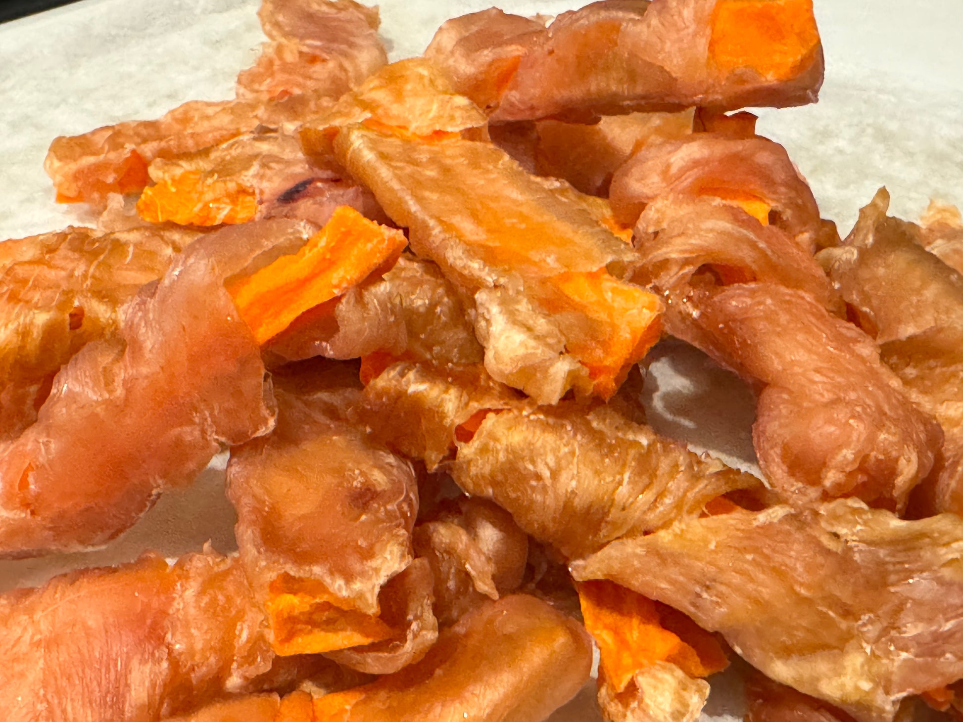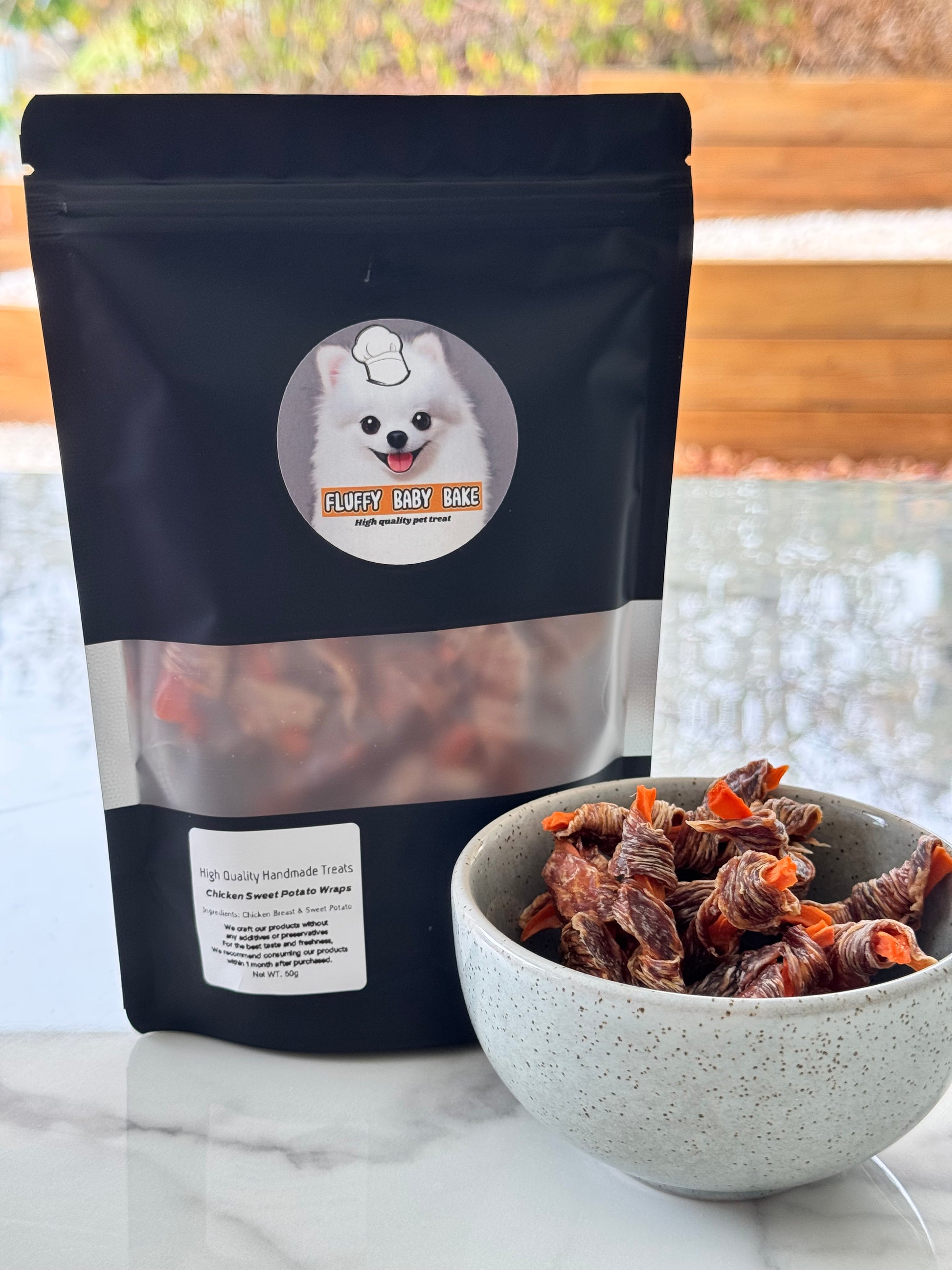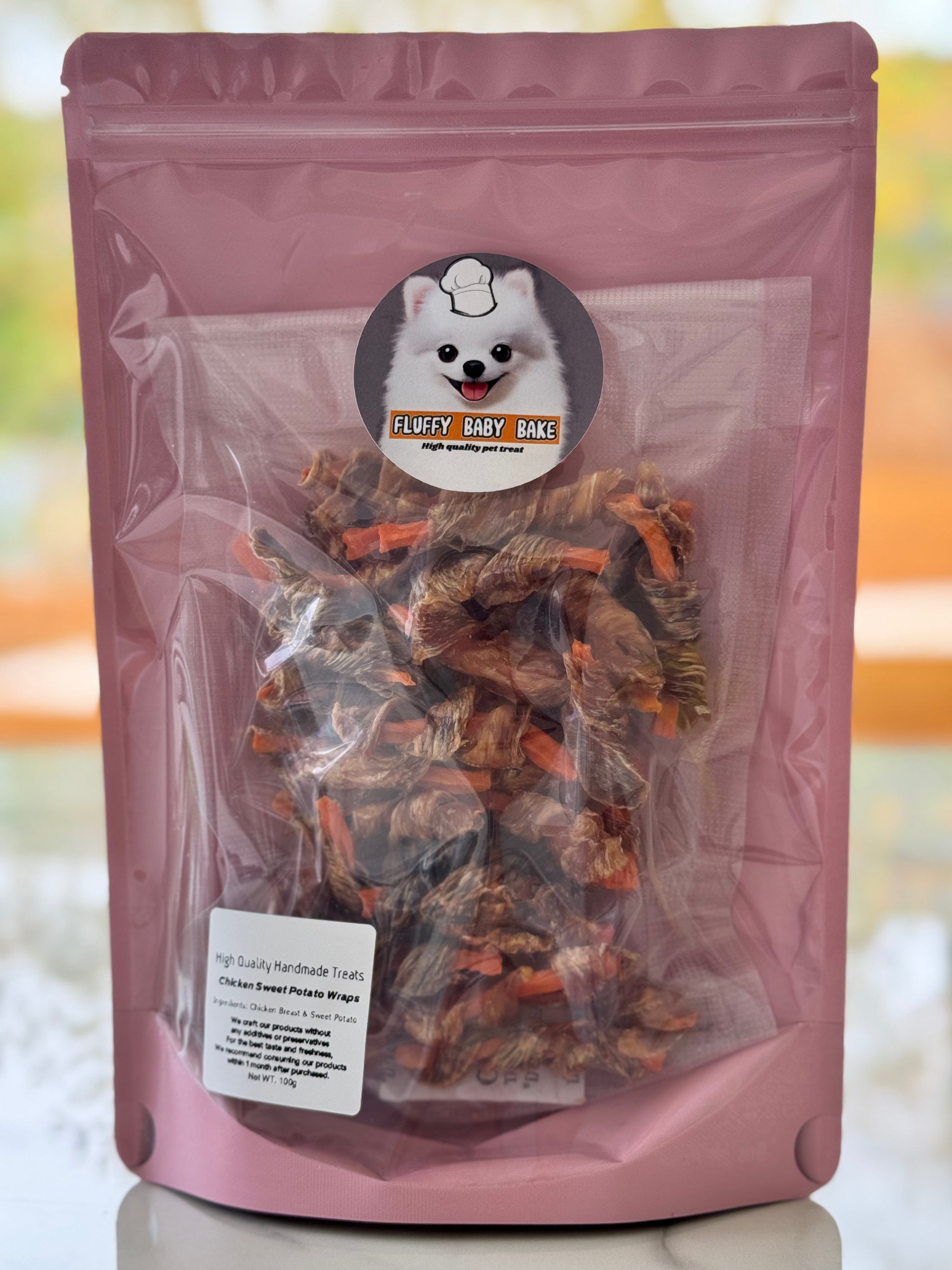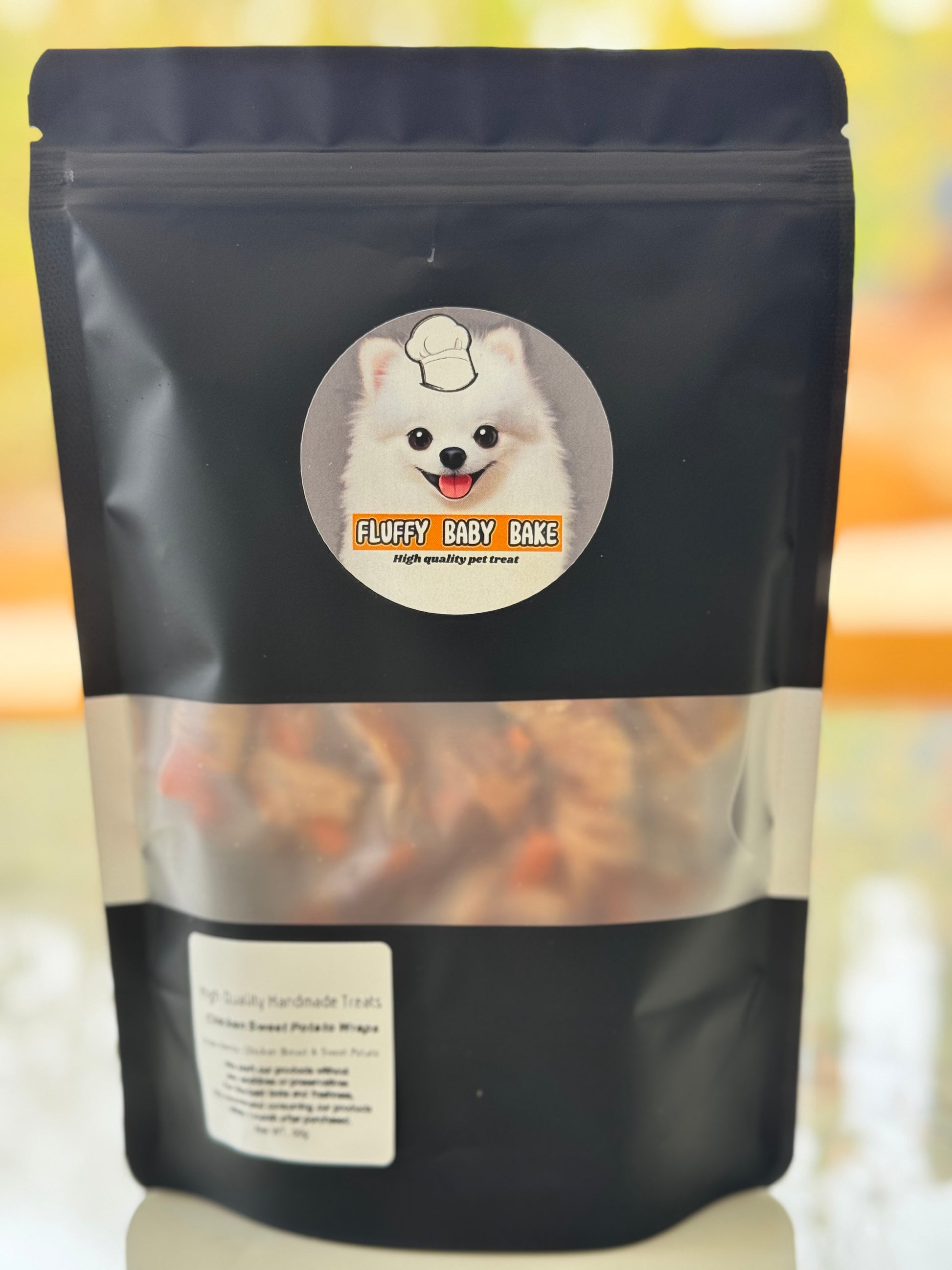 At Fluffy Baby Bake, we hand-wrap each treat in small batches using ethically sourced chicken and fresh, skin-free sweet potatoes. Slowly dehydrated to preserve nutrients and maximise chewiness, these wraps are made in a human-food-grade facility that prioritises safety and quality.